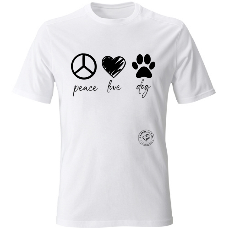 T-Shirt Solidale "Peace, Love, Dog" By Giulia Polizzano. Il ricavato verrà utilizzato per cibo, materiale e cure per i nostri pelosi.