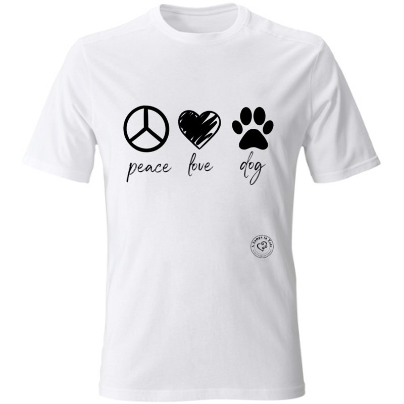 T-Shirt Solidale "Peace, Love, Dog" By Giulia Polizzano. Il ricavato verrà utilizzato per cibo, materiale e cure per i nostri pelosi.